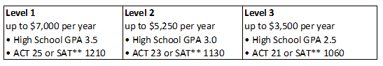 이 Scholarship 을 신청하기위해서는FAFSA 를 6/30/2026 전에 Summit 해야만합니다. 이 Scholarship 은 아래와같이 Scholarship을 신청하는 학생들의 성적과 SAT/ACT시험점수에 따라 Scholarship 금액이 다르게 책정됩니다.