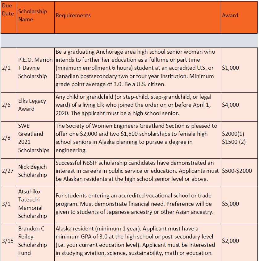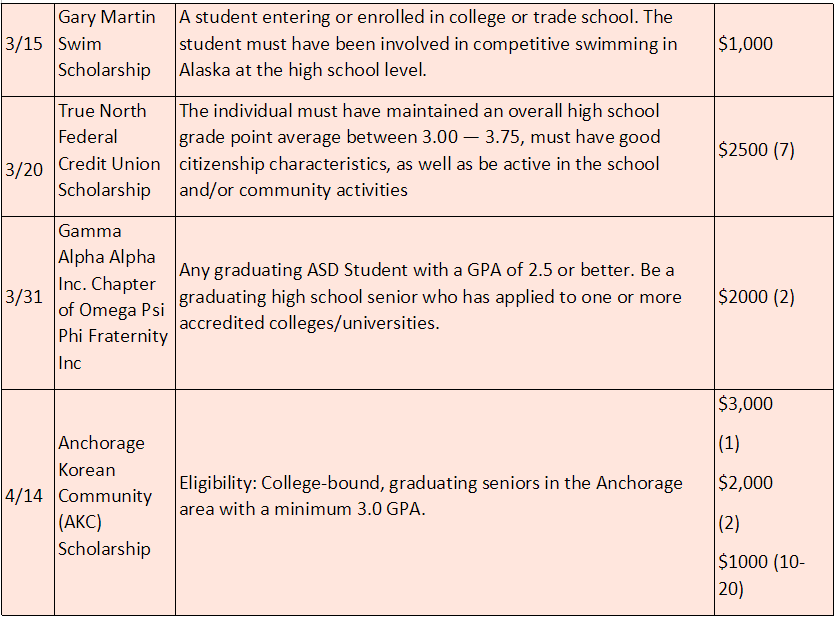 Alaska Local 장학금 경쟁률은 National 장학금 경쟁률과 비교가 안되게 낮아서 장학금수상의 기회가 아주높습니다. ASD (Anchorage School District) Website 의 Update 가 제대로 안되어있는 관계로 대부분의 장학금들이2025년도 Scholarship 마감일을 그대로 사용했습니다. 학생들의 고등학교 Career Resource Center (CRC) 에 연락해서 2026 년도 장학금마감일에관한 정보를 확인해보시기바랍니다.