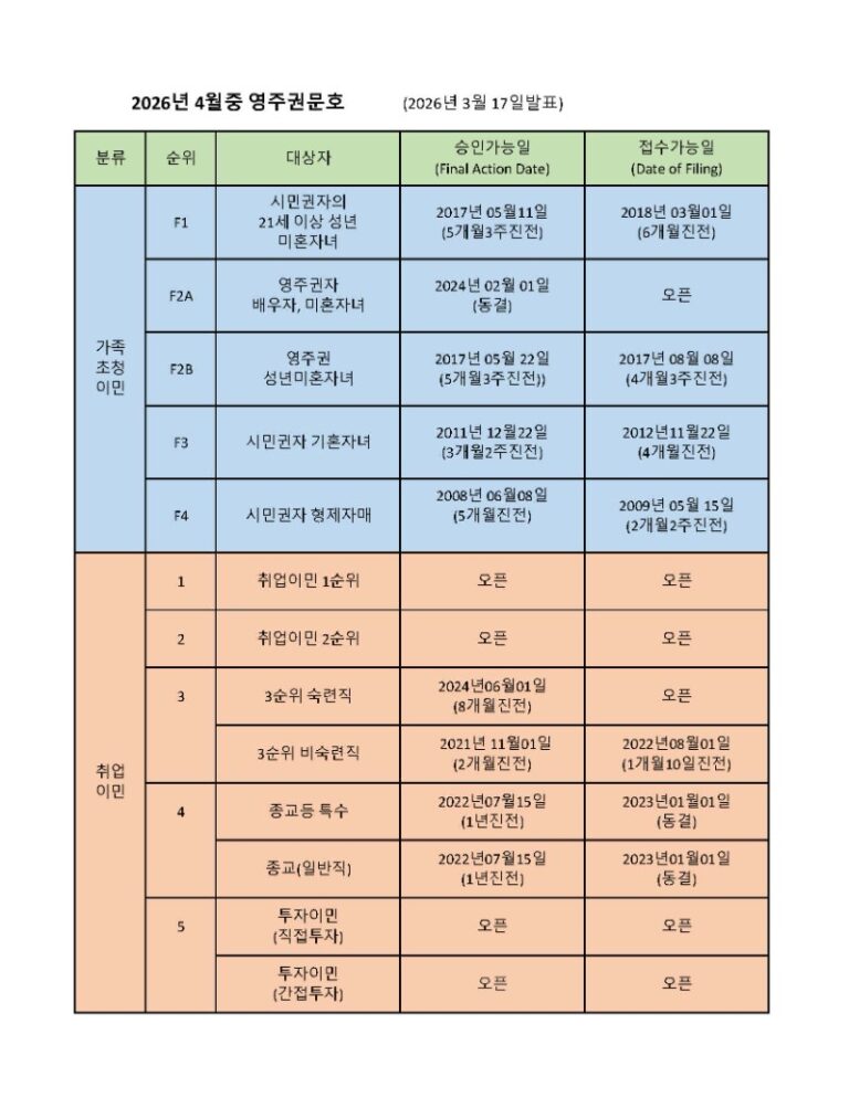 미국 국무부(DOS)는 3월 17일 2026년 4월중 영주권문호(Visa Bulletin)를 발표했습니다. 4월 영주권문호에서는 취업이민 3순위 숙련직과 전문직의 영주권 접수가능일(Filing Date)이 오픈되는등 큰폭의 크게 진전이 되었습니다. 가족이민의경우도 승인가능일(Final Action Date) 과 접수가능일(Filing Date)이 크게 진전되었습니다.