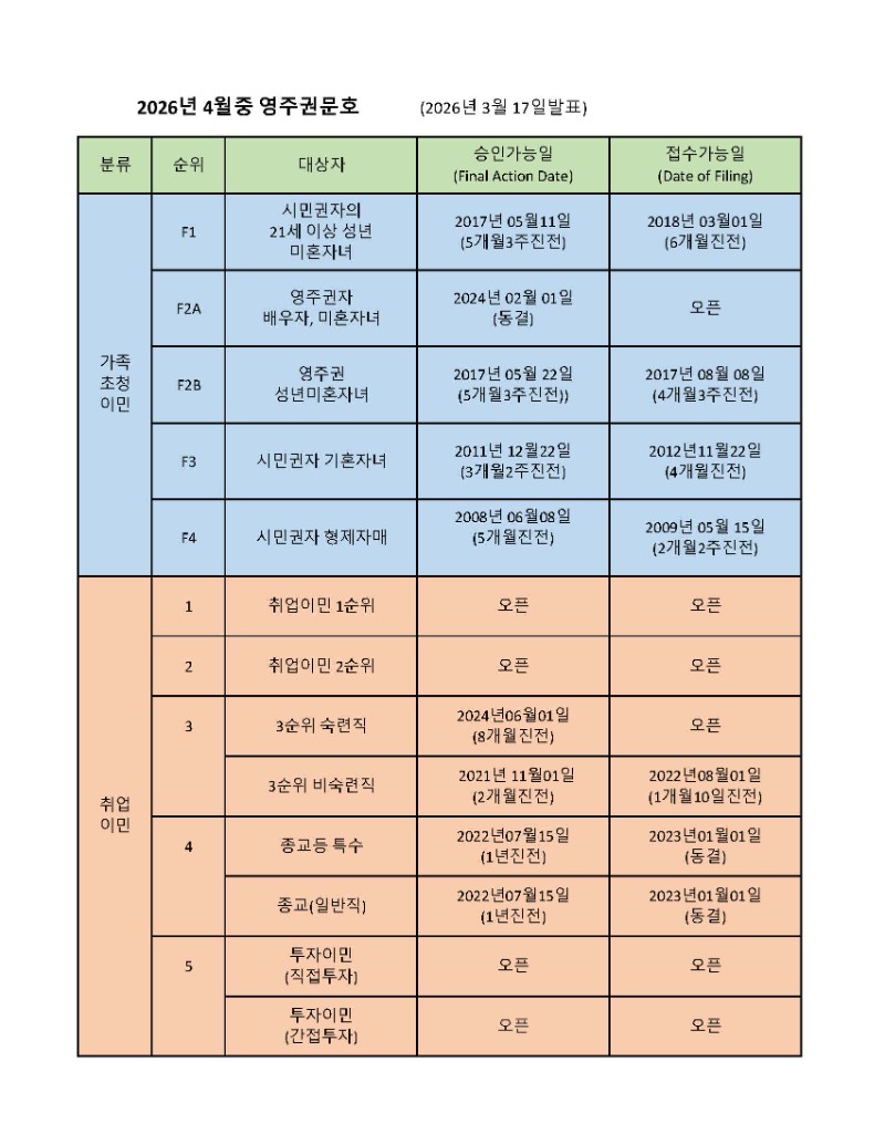 2026년 4월의 영주권 문호에서 시민권자의 21세이상 성년미혼자녀들이 대상인 가족이민 1순위는 승인가능일 (Final Action Date) 이 2017년 5월 11일로 5개월 3주 진전되었으며, 접수가능일 (Filing Date)은 2018년 3월 1일로 6개월진전 되었습니다.