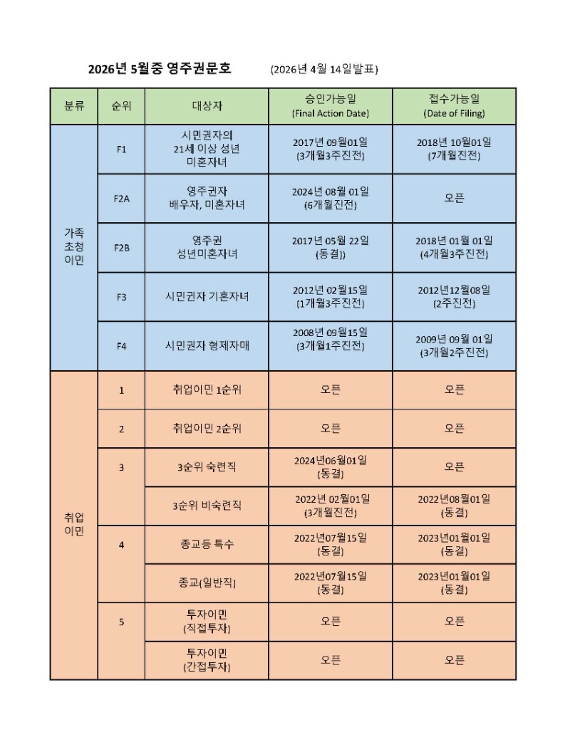 미국 국무부(DOS)는 4월 14일 2026년 5월중 영주권문호(Visa Bulletin)를 발표했습니다. 5월 영주권문호에서는 취업이민은 4월의 대폭 진전과 달리 대부분 동결 되었습니다. 가족이민의경우는 5월에도 승인가능일(Final Action Date) 과 접수가능일(Filing Date)이 크게 진전되었습니다.