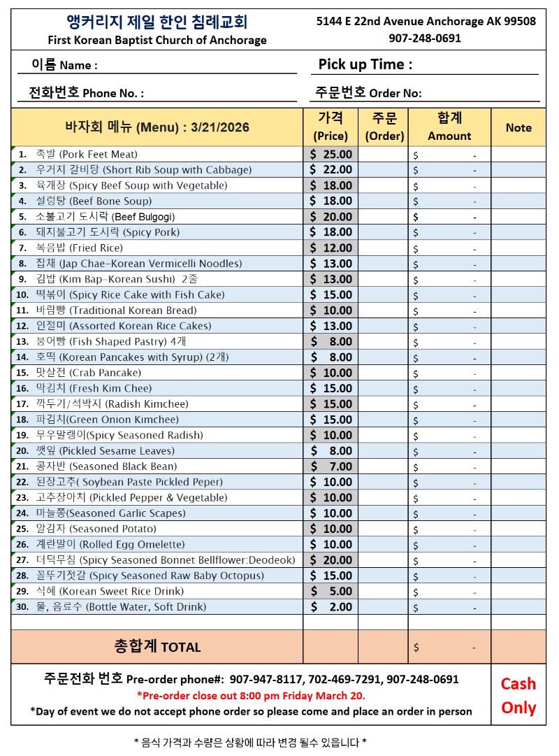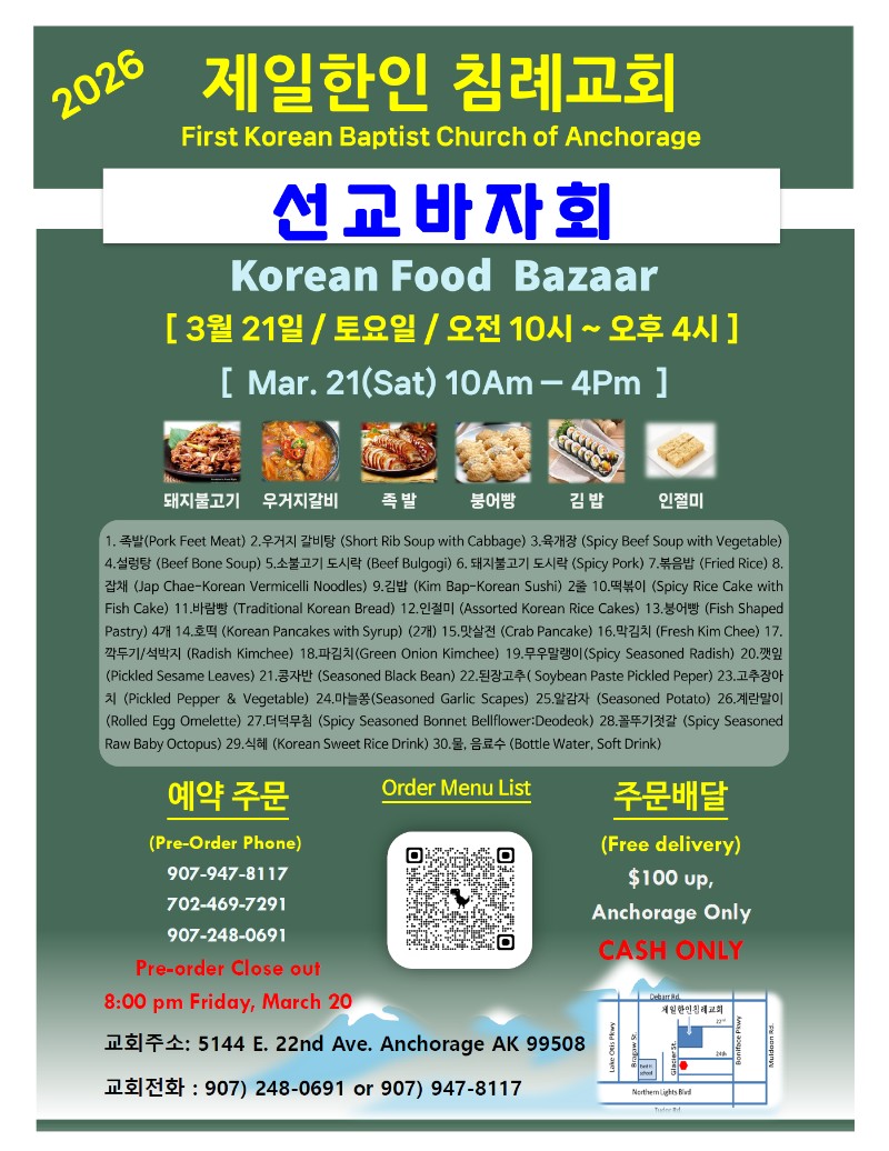 | NEW 3월 21일 토요일 앵커리지 제일한인침례교회 선교 바자회 | 03.07.2026 | 12 |