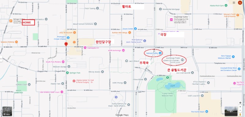 버스정류장은 artic 및 36 가 spenard길 다 가깝고요
